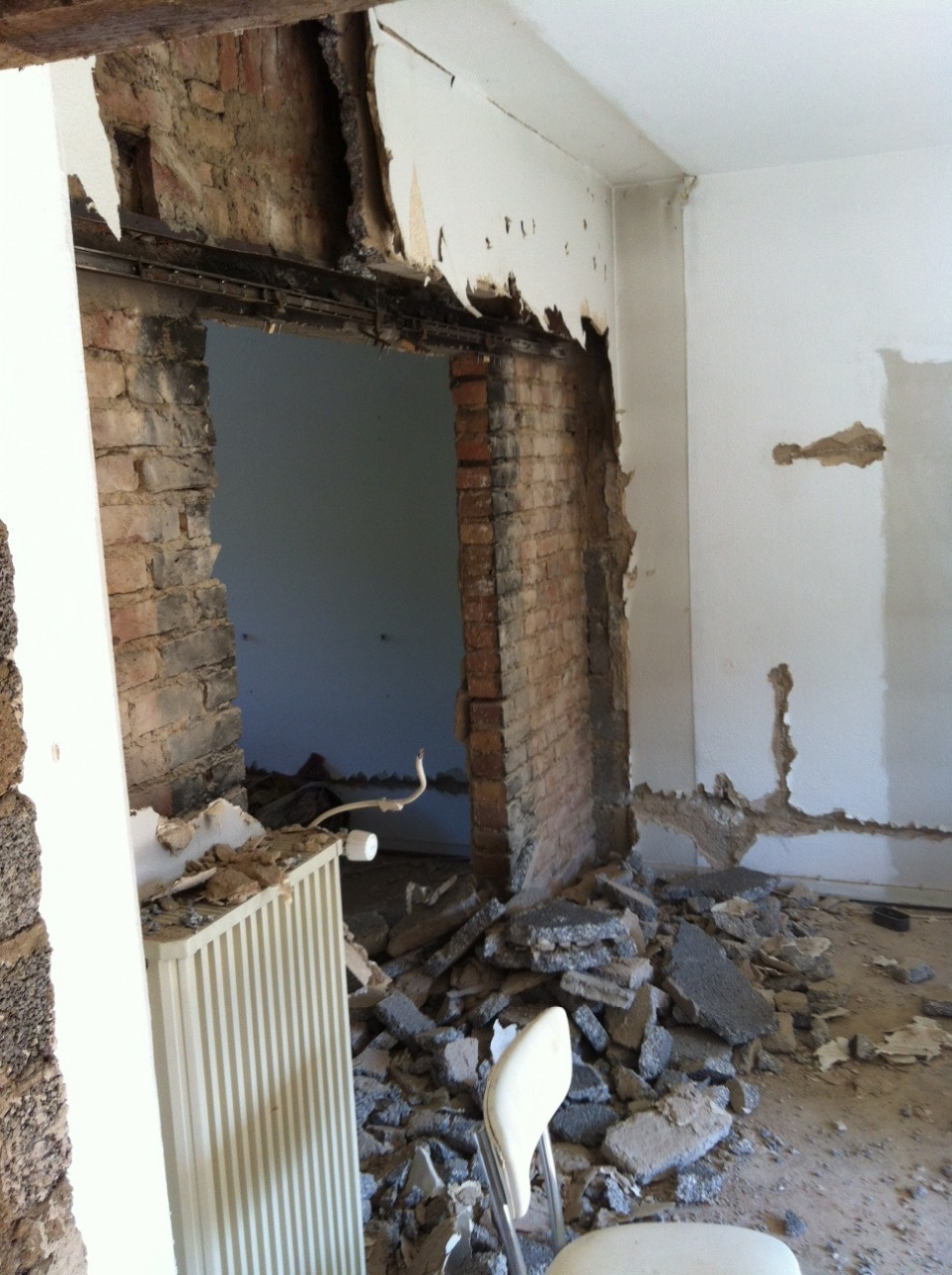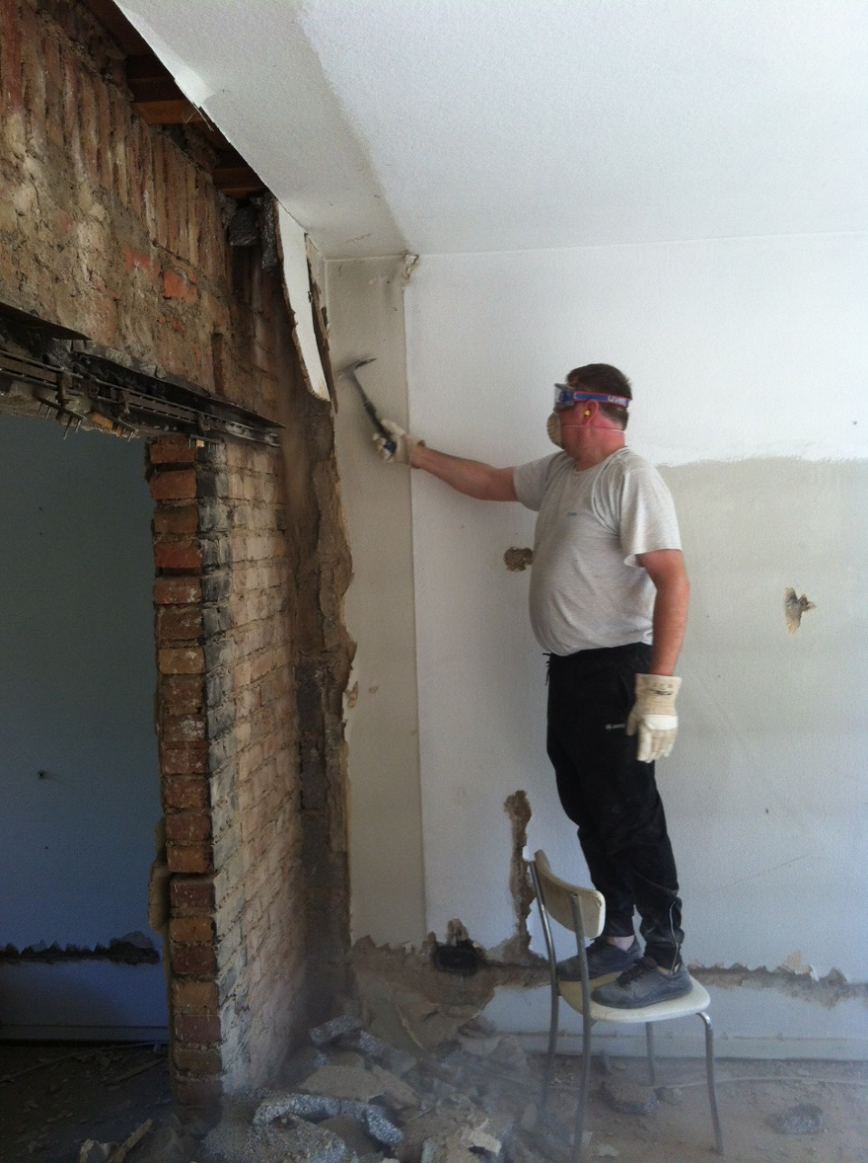 22.07.2013 22:58Heute wurde die Trennwand aus alten Backsteinen zwischen Wohnzimmer und Esszimmer im Erdgeschoss freigelegt. Auch Damir hat heute tatkräftig geholfen. Geplant ist, die Wand zu restaurieren und in das Wohnzimmerbild zu integrieren. Dabei werden alle Backsteine mit einer Drahtbürste abgebürstet und die Fugen werden neu verfugt.