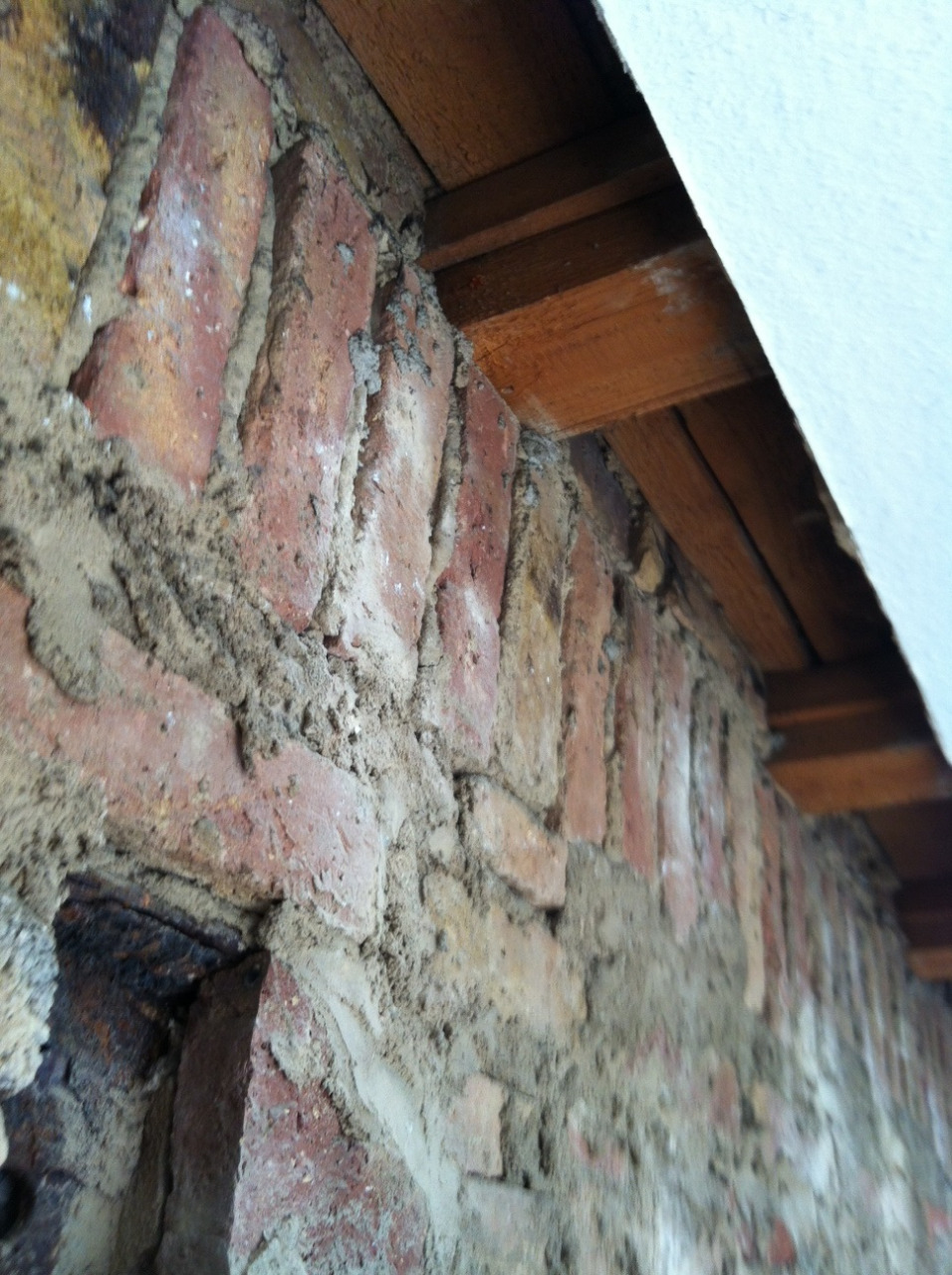 HIer sieht man die alte Holzbalkendecke sehr gut. Auch diese wird freigelegt und fügt sich dann später perfekt in die Wand aus Backsteinen.